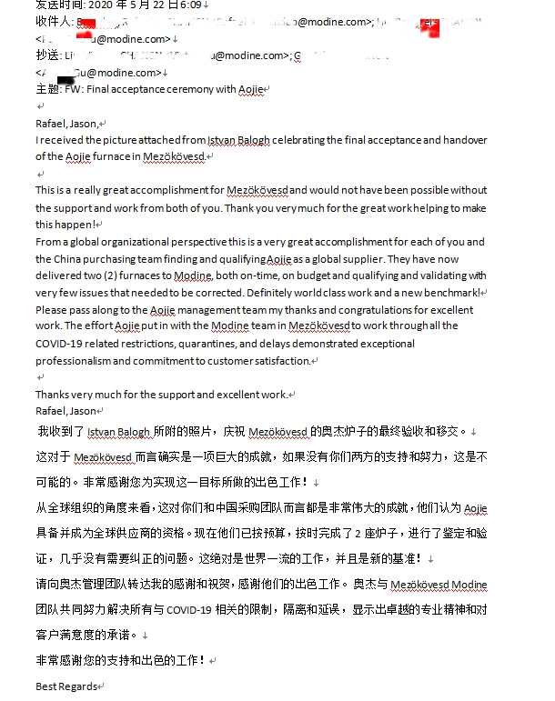 5月21日下午,西安奧杰電熱設(shè)備工程有限責(zé)任公司匈牙利摩丁鋁釬焊爐項目順利通過驗收并完成移交,完美收官。