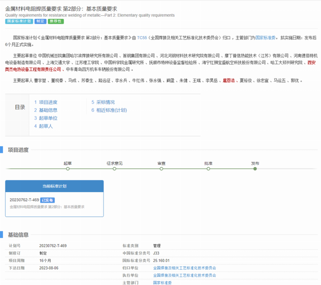 近日,西安奧杰電熱設(shè)備工程有限責(zé)任公司(簡(jiǎn)稱:西安奧杰)與中國(guó)機(jī)械總院集團(tuán)哈爾濱焊接研究所有限公司等多家科研機(jī)構(gòu)及龍頭企業(yè)共同參與制定的《金屬材料電阻焊質(zhì)量要求 第2部分:基本質(zhì)量要求》國(guó)家標(biāo)準(zhǔn)正式發(fā)布實(shí)施。該標(biāo)準(zhǔn)于2023年08月06日下達(dá),于2025年5月30日發(fā)布,于2025年12月1日實(shí)施。